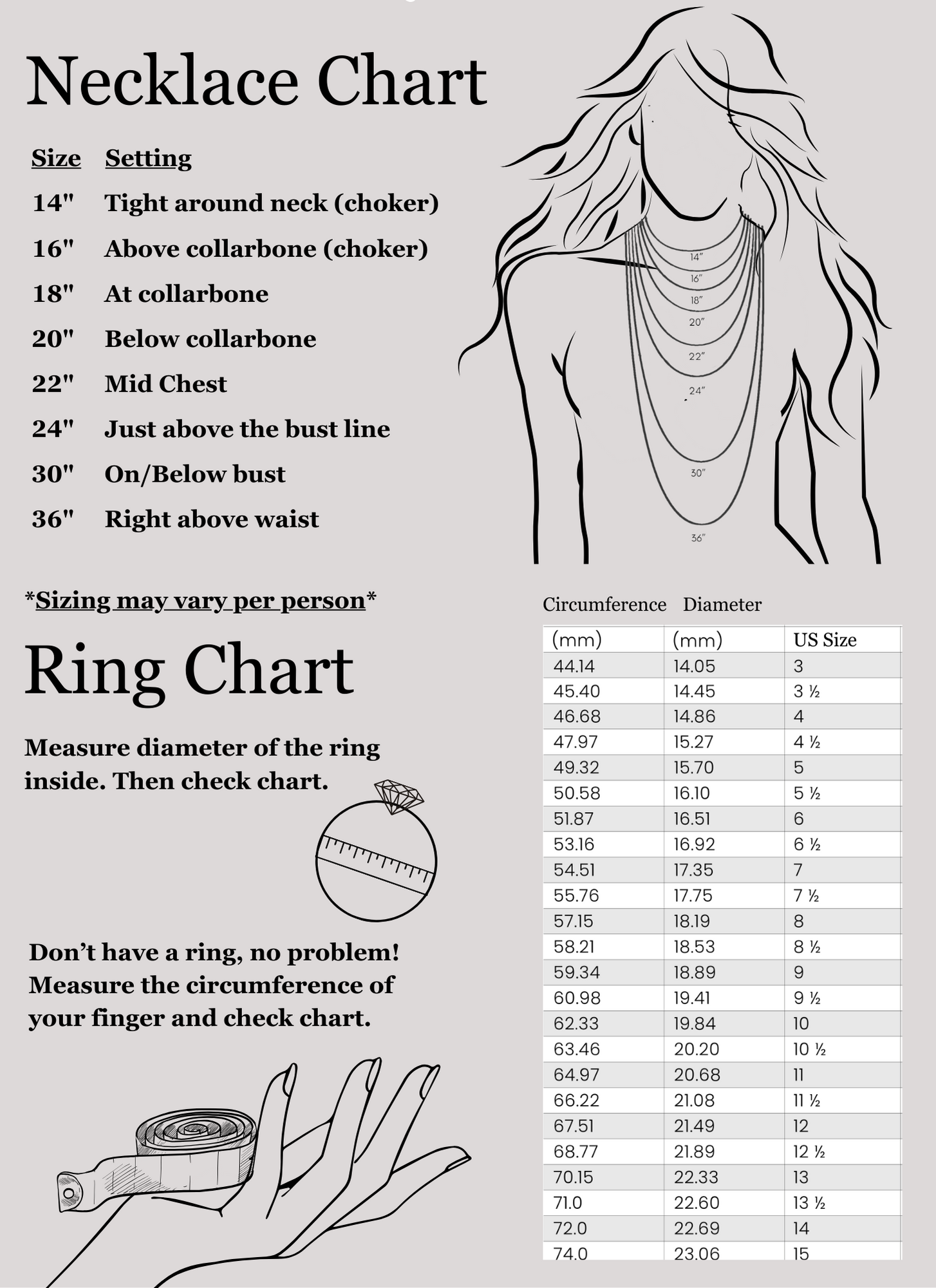 Looking to find the right sizing for you? Check out our necklace and ring sizing. Reminder: Sizing may vary per person. If you have a question, hit the button below!